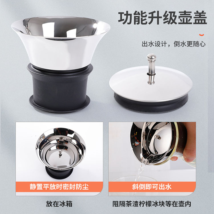 食品接觸用304不銹鋼。防塵、過濾、出水一體可拆卸,易清洗。出水設計,倒水更隨心。靜置平放時密封防塵,斜倒即可出水。放在冰箱,阻隔茶渣檸檬冰塊等在壺內。硅膠,不銹鋼蓋,內設硅膠圈,不易掉落。